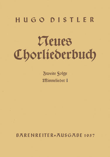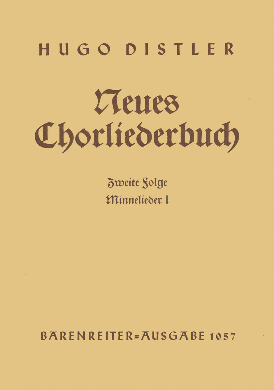 **Title**: Minnelieder I. Neues Chorliederbuch zu Worten von Hans Grunow op. 16/2 (1936/1938) | **Misc Information**: Folge 2 | **Composer / Author**: Distler, Hugo | **Libretto/Text by**: Grunow, Heinz | **Edition Type**: Choral score | **Instrumentation**: Choir | **Scoring/ Instrumentation**: Mixed choir | **Binding**: Stapled | **Level of Difficulty**: 4.0 | **Weight**: 63.0 g | **Format**: 29,0 x 21,0 cm | **Pages**: 11 S. | **Language**: EN | Sample: https://data.baerenreiter.com/NB/BA/BA01057_00_9790006407880_nb_lrg_01.jpg