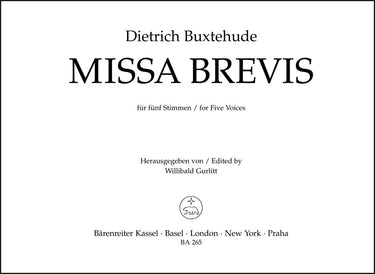 **Title**: Missa brevis for Five Voices | **Composer / Author**: Buxtehude, Dietrich | **Editor**: Gurlitt, Wilibald | **Edition Type**: Choral score | **Instrumentation**: Choir, Basso continuo | **Scoring/ Instrumentation**: Mixed choir (SSATB), Basso continuo | **Binding**: Stapled | **Level of Difficulty**: 3.0 | **Printing**: 22nd printing 2020 | **Language of Text Part**: Latin | **Weight**: 77.0 g | **Format**: 19,0 x 25,8 cm | **Pages**: 31 S. | **Language**: EN | Sample: https://data.baerenreiter.com/NB/BA/BA00265_00_9790006401192_nb_lrg_01.jpg