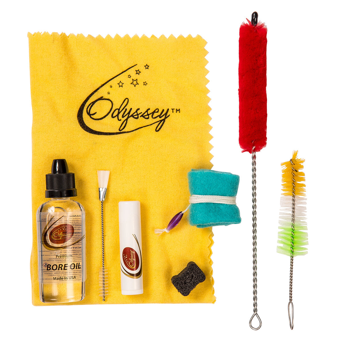 Polish cloth, weighted pull-thru swab, multi-purpose duster brush, nylon mouthpiece brush, cotton bore swab, bore oil, cork grease stick, thumb rest cushion, care guide.