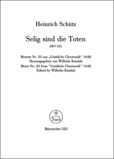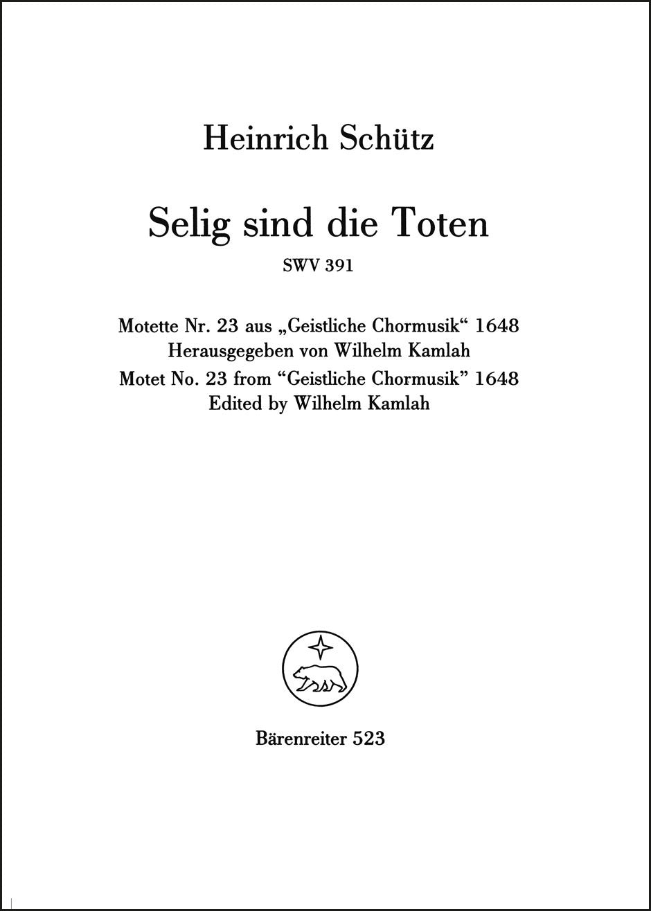 **Title**: Selig sind die Toten SWV 391 | **Subtitle**: Motet | **Misc Information**: no. 23 from "Geistliche Chormusik 1648" | **Composer / Author**: Schutz, Heinrich | **Editor**: Kamlah, Wilhelm | **Edition Type**: Choral score, Urtext edition | **Instrumentation**: Choir, Basso continuo | **Scoring/ Instrumentation**: Mixed choir: SSATTB, Basso continuo ad libitum | **Binding**: Stapled | **Level of Difficulty**: 3.0 | **Printing**: 16th printing 2008 | **Weight**: 18.0 g | **Format**: 27,0 x 19,0 cm | **Pages**: 6 S. | **Language**: EN | Sample: https://data.baerenreiter.com/NB/BA/BA00523_00_9790006403202_nb_lrg_01.jpg