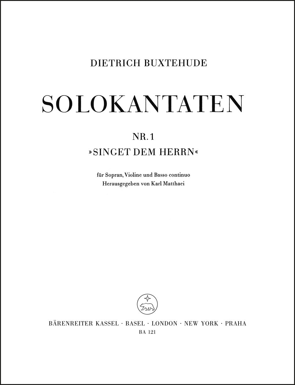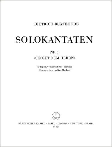 **Title**: Singet dem Herrn | **Subtitle**: Solo cantata | **Composer / Author**: Buxtehude, Dietrich | **Editor**: Matthaei, Karl | **Edition Type**: Score, Set of parts | **Scoring/ Instrumentation**: Soprano solo, Violin, Basso continuo | **Binding**: Stapled | **Printing**: 17th printing 2017 | **Language of Text Part**: German | **Weight**: 120.0 g | **Format**: 30,0 x 23,0 cm | **Pages**: 15/4/4/4 S. | **Language**: EN | Sample: https://data.baerenreiter.com/NB/BA/BA00121_00_9790006400409_nb_lrg_01.jpg