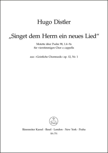 **Title**: Singet dem Herrn ein neues Lied op. 12/1 | **Subtitle**: Motet on Psalm 98/1, 4-9a op. 12/1 from "Geistliche Chormusik" op. 12 | **Misc Information**: Gothic Print | **Composer / Author**: Distler, Hugo | **Edition Type**: Choral score | **Instrumentation**: Choir | **Scoring/ Instrumentation**: Mixed choir (SATB) | **Binding**: Stapled | **Level of Difficulty**: 4.0 | **Printing**: 19th printing 2017 | **Language of Text Part**: German | **Weight**: 30.0 g | **Format**: 27,0 x 19,0 cm | **Pages**: 12 S. | **Language**: EN | Sample: https://data.baerenreiter.com/NB/BA/BA00751_00_9790006405152_nb_lrg_01.jpg