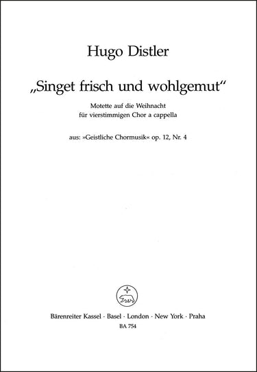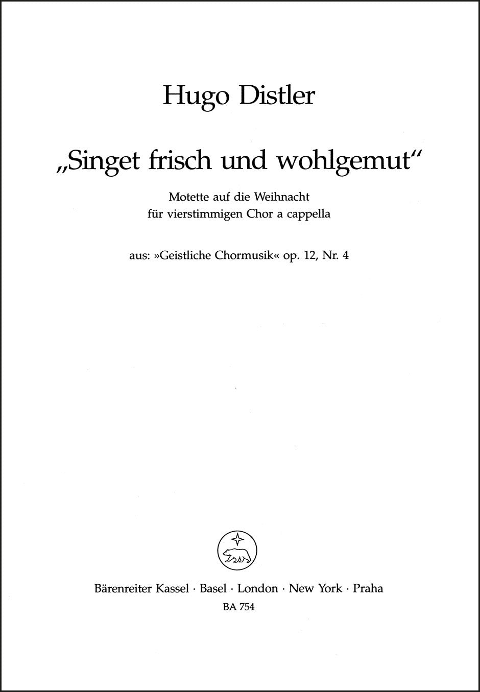 **Title**: Singet frisch und wohlgemut for Four-part choir op. 12/4 | **Subtitle**: Motet for Christmas | **Misc Information**: No. 4 from "Geistliche Chormusik" (1934-1941 | **Composer / Author**: Distler, Hugo | **Edition Type**: Choral score | **Instrumentation**: Choir | **Scoring/ Instrumentation**: Mixed choir (SATB) | **Binding**: Stapled | **Level of Difficulty**: 4.0 | **Printing**: 19th printing 2011 | **Weight**: 27.0 g | **Format**: 27,0 x 19,0 cm | **Pages**: 12 S. | **Language**: EN | Sample: https://data.baerenreiter.com/NB/BA/BA00754_00_9790006405190_nb_lrg_01.jpg