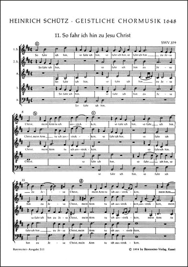 **Title**: So fahr ich hin zu Jesu Christ SWV 379 | **Subtitle**: Motette | **Misc Information**: Nr. 11 aus "Geistliche Chormusik" (1648) | **Composer / Author**: Schutz, Heinrich | **Editor**: Kamlah, Wilhelm | **Edition Type**: Choral score, Urtext edition | **Instrumentation**: Choir, Basso continuo | **Scoring/ Instrumentation**: Mixed choir: SSATB, Basso continuo ad libitum | **Binding**: Stapled | **Level of Difficulty**: 3.0 | **Weight**: 9.0 g | **Format**: 27,0 x 19,0 cm | **Pages**: 4 S. | **Language**: EN | Sample: https://data.baerenreiter.com/NB/BA/BA00511_00_9790006403080_nb_lrg_01.jpg