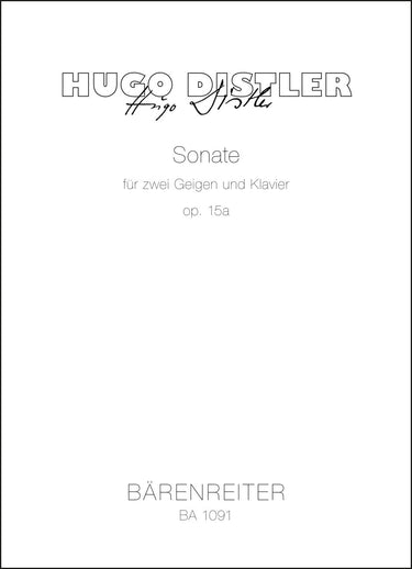 **Title**: Sonate für zwei Geigen und Klavier op. 15a | **Misc Information**: über alte deutsche Volkslieder | **Composer / Author**: Distler, Hugo | **Edition Type**: Performance score, Set of parts | **Instrumentation**: Violin, Piano | **Scoring/ Instrumentation**: Violins (2), Piano | **Binding**: Stapled | **Level of Difficulty**: 3.0 | **Printing**: 6. Aufl. 2012 | **Weight**: 177.0 g | **Format**: 29,7 x 20,7 cm | **Pages**: 28/7/7 S. | **Language**: EN | Sample: https://data.baerenreiter.com/NB/BA/BA01091_00_9790006408092_nb_lrg_01.jpg
