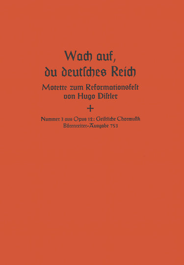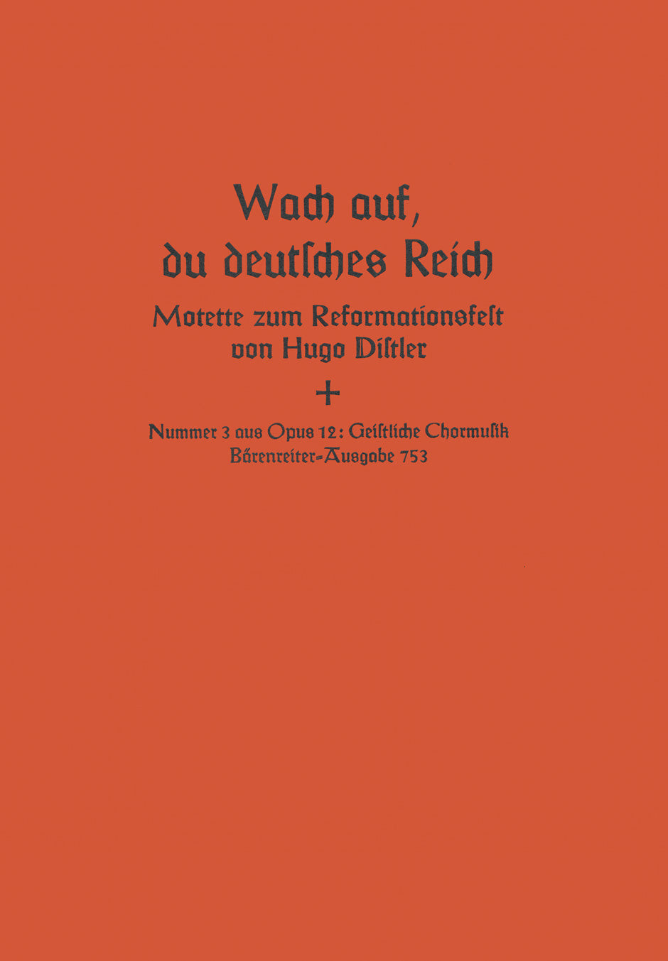 **Title**: Wach auf, du deutsches Reich no. 3 | **Subtitle**: Motette zum Reformationsfest | **Misc Information**: aus "Geistliche Chormusik" op. 12 (1934-1941) | **Composer / Author**: Distler, Hugo | **Edition Type**: Choral score | **Scoring/ Instrumentation**: Soprano solo (2), Mixed choir (SATB) | **Binding**: Stapled | **Level of Difficulty**: 3.0 | **Weight**: 34.0 g | **Pages**: 15 S. | **Language**: EN | Sample: https://data.baerenreiter.com/NB/BA/BA00753_00_9790006405183_nb_lrg_01.jpg
