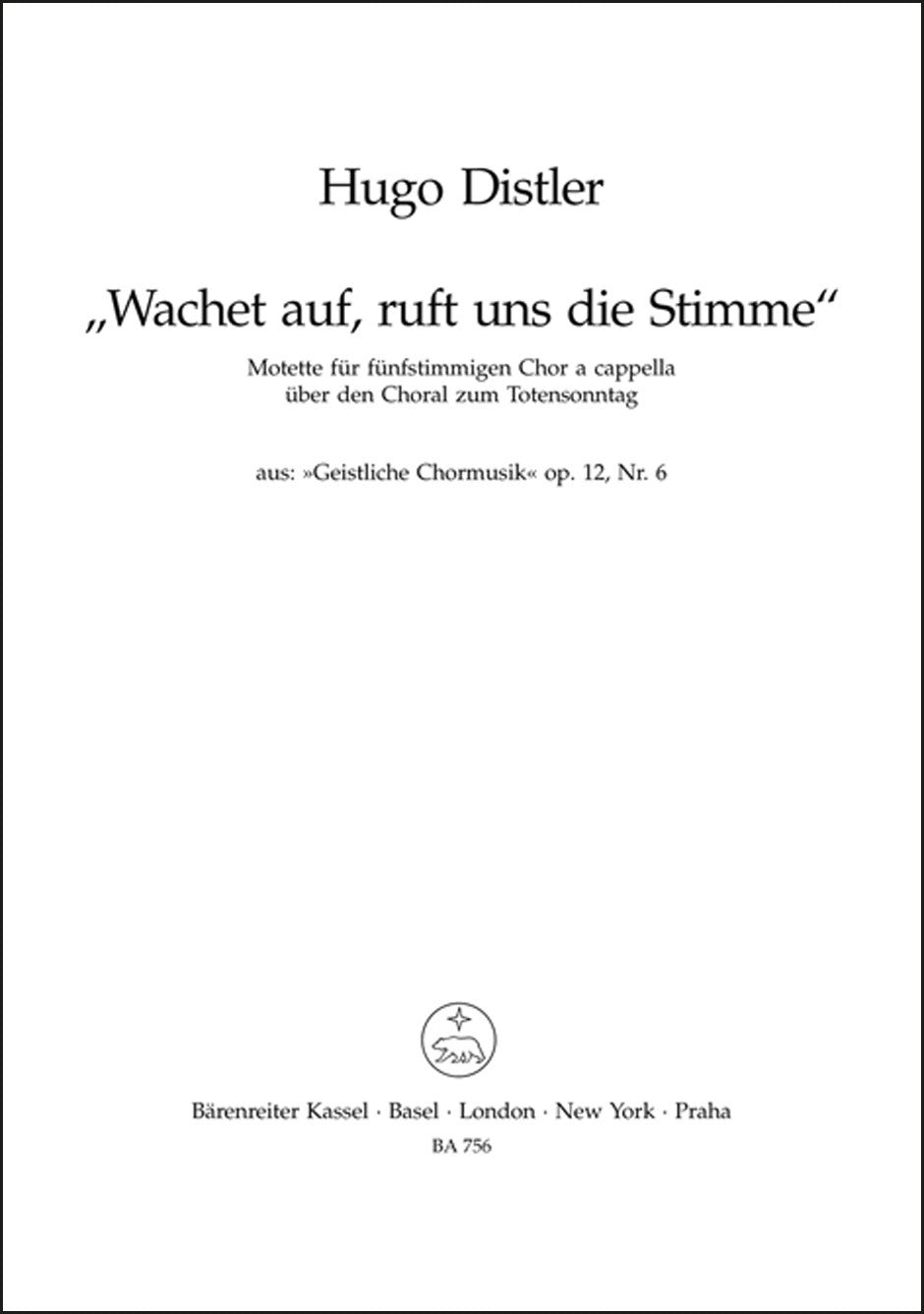 **Title**: Wachet auf, ruft uns die Stimme für fünfstimmigen Chor a cappella no. 6 | **Subtitle**: Motette über den Choral zum Totensonntag | **Misc Information**: aus "Geistliche Chormusik" op. 12 (1934-1941) | **Comments**: Frakturschrift | **Composer / Author**: Distler, Hugo | **Edition Type**: Choral score | **Scoring/ Instrumentation**: Soprano solo (2), Mixed choir: SSATB | **Binding**: Stapled | **Level of Difficulty**: 4.0 | **Printing**: 18. Aufl. 2019 | **Language of Text Part**: German | **Weight**: 41.0 g | **Format**: 27,0 x 19,0 cm | **Pages**: 16 S. | **Language**: EN | Sample: https://data.baerenreiter.com/NB/BA/BA00756_00_9790006405213_nb_lrg_01.jpg