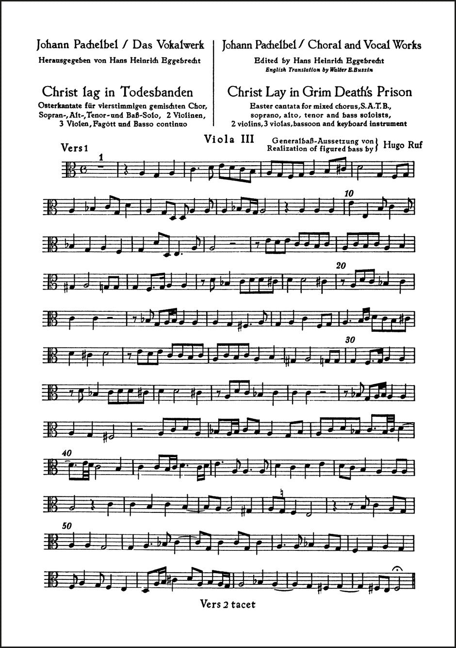**Title**: Christ lay in grim death's prison | **Subtitle**: Easter Cantata | **Composer / Author**: Pachelbel, Johann | **Editor**: Eggebrecht, Hans Heinrich | **Edition Type**: Part | **Scoring/ Instrumentation**: 3. Viola | **Binding**: Stapled | **Weight**: 10.0 g | **Format**: 27,0 x 19,0 cm | **Pages**: 4 S. | **Language**: EN | Sample: https://data.baerenreiter.com/NB/BA/BA02875_81_9790006426768_nb_lrg_01.jpg