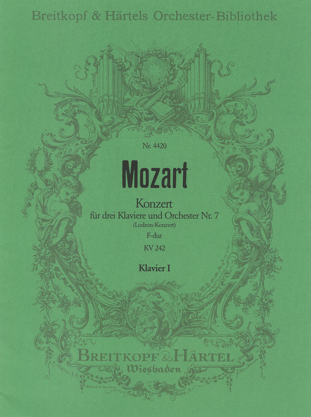 Piano Concerto [No. 7] in F major K. 242 | Lodron Concerto | 3pno,orch | solos: 3pno – 0.2.0.0 – 2.0.0.0 – str | Orchestra | Orchestra | Triple concertos | 25' | Classical | Solo concerto | Sheet Music | solo pno 1 | | | 20 | stapled | 23 x 30,5 cm