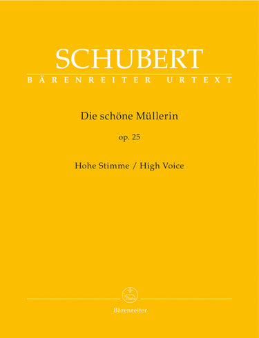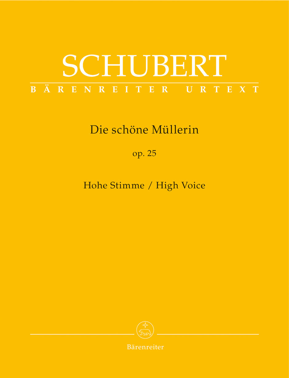 **Title**: Die schöne Müllerin op. 25 D 795 | **Misc Information**: High Voice | **Comments**: Replaces BA 7000 | **Composer / Author**: Schubert, Franz | **Libretto/Text by**: Müller, Wilhelm | **Editor**: Dürr, Walther | **Edition Type**: Singing Score, Urtext edition | **Scoring/ Instrumentation**: High voice, Piano | **Binding**: Stapled | **Printing**: 6th printing 2023 | **Language of Text Part**: German | **Weight**: 300.0 g | **Format**: 30,0 x 23,0 cm | **Pages**: XIX, 55 S. | **Language**: EN | Sample: https://data.baerenreiter.com/NB/BA/BA09117_00_9790006539680_nb_lrg_01.jpg