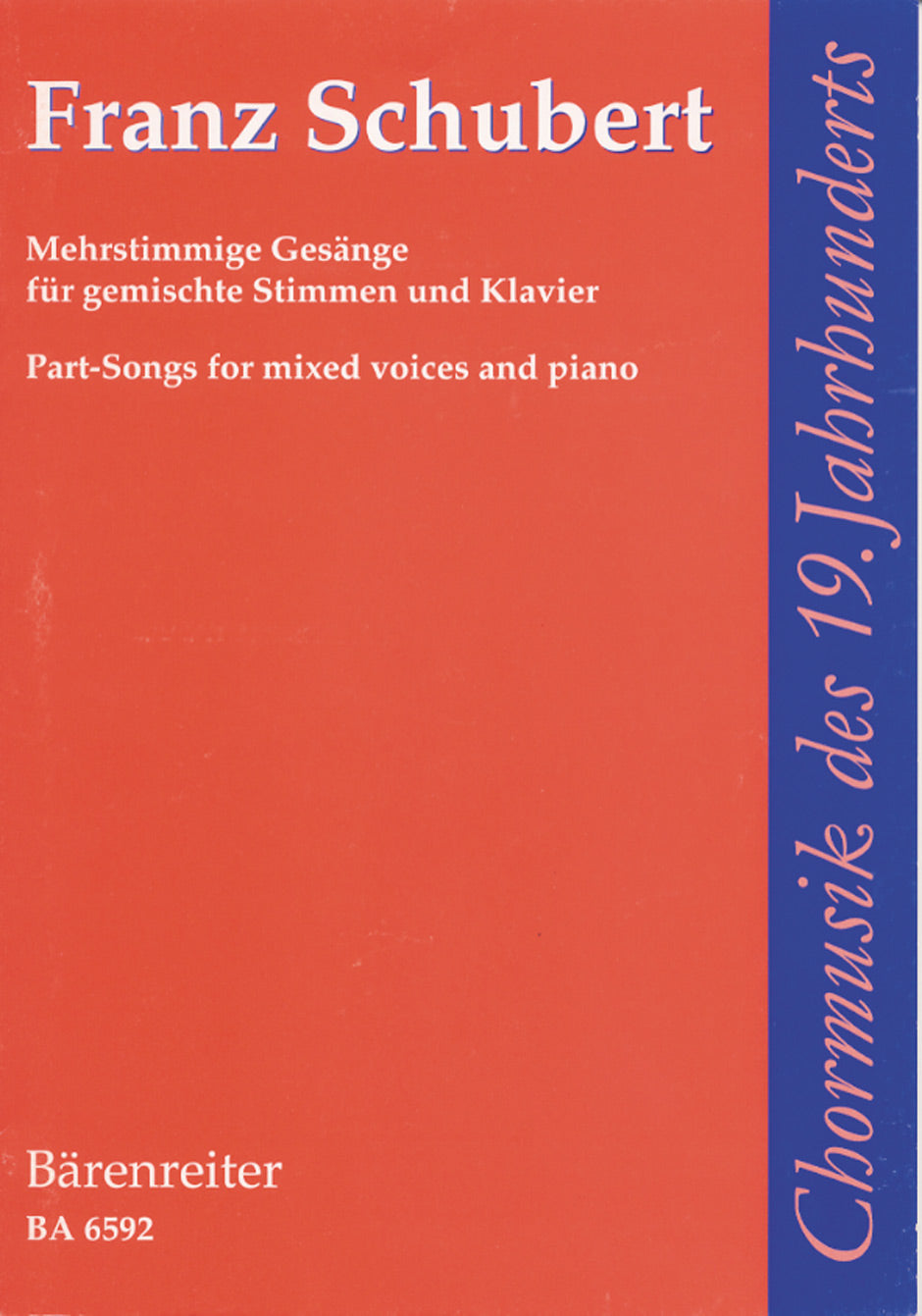 **Title**: Mehrstimmige Gesänge für gemischte Stimmen und Klavier | **Subtitle**: 5 Chöre, Einzelausgabe aus der Neuen Scheubert-Ausgabe | **Composer / Author**: Schubert, Franz | **Editor**: Berke, Dietrich | **Edition Type**: Choral score, Anthology, Urtext edition | **Instrumentation**: Choir, Piano | **Scoring/ Instrumentation**: Mixed choir, Piano | **Binding**: Stapled | **Level of Difficulty**: 3.0 | **Printing**: 5. Aufl. 2016 | **Weight**: 150.0 g | **Format**: 27,0 x 19,0 cm | **Pages**: 47 S. | **Language**: EN | Sample: https://data.baerenreiter.com/NB/BA/BA06592_00_9790006501670_nb_lrg_01.jpg