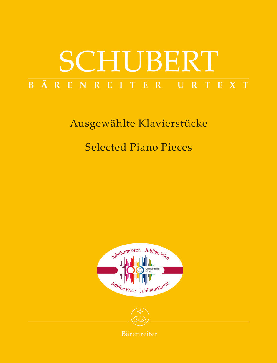 **Title**: Selected Piano Pieces | **Comments**: Excerpt from BA09634, BA09647 | **Comments on Version**: Jubilee Edition - 100 Years of Bärenreiter | **Composer / Author**: Schubert, Franz | **Edition Type**: Performance score, Urtext edition | **Instrumentation**: Piano solo | **Binding**: Stapled | **Level of Difficulty**: 4.0 | **Printing**: 2nd printing 2023 | **Weight**: 103.0 g | **Format**: 31,0 x 24,3 cm | **Pages**: 15 S. | **Language**: EN | Sample: https://data.baerenreiter.com/NB/BA/BA08641_00_9790006577330_nb_lrg_01.jpg