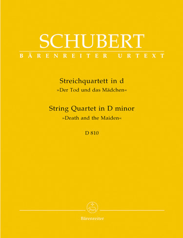 **Title**: String Quartet in D minor D 810 "Der Tod und das Mädchen" | **Composer / Author**: Schubert, Franz | **Editor**: Aderhold, Werner | **Edition Type**: Set of parts, Urtext edition | **Instrumentation**: String quartet | **Scoring/ Instrumentation**: Violins (2), Viola, Violoncello | **Binding**: Stapled | **Level of Difficulty**: 3.0 | **Duration**: 00:42:00 | **Printing**: 11th printing 2022 | **Weight**: 327.0 g | **Format**: 31,0 x 24,3 cm | **Pages**: 19/18/16/15 S. | **Language**: EN | Sample: https://data.baerenreiter.com/NB/BA/BA05613_00_9790006472796_nb_lrg_01.jpg