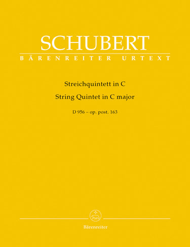 **Title**: String Quintet in C major op. post 163 D 956 | **Composer / Author**: Schubert, Franz | **Editor**: Chusid, Martin | **Edition Type**: Set of parts, Urtext edition | **Scoring/ Instrumentation**: Violins (2), Viola, Violoncellos (2) | **Binding**: Stapled | **Level of Difficulty**: 4.0 | **Printing**: 13th printing 2023 | **Weight**: 419.0 g | **Format**: 31,0 x 24,5 cm | **Pages**: 19/19/19/19/19 S. | **Language**: EN | Sample: https://data.baerenreiter.com/NB/BA/BA05612_00_9790006472789_nb_lrg_01.jpg