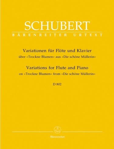 **Title**: Variations on "Trockne Blumen" for Flute and Piano op. post.160 D 802 | **Misc Information**: from "Die schöne Müllerin" | **Composer / Author**: Schubert, Franz | **Editor**: Adorján, András / Wirth, Helmut | **Edition Type**: Performance score, Part, Urtext edition | **Instrumentation**: Flute, Piano | **Scoring/ Instrumentation**: Flute, Piano | **Binding**: Stapled | **Printing**: 10th printing 2023 | **Weight**: 207.0 g | **Format**: 31,0 x 24,3 cm | **Pages**: 29/11 S. | **Language**: EN | Sample: https://data.baerenreiter.com/NB/BA/BA05641_00_9790006482900_nb_lrg_01.jpg