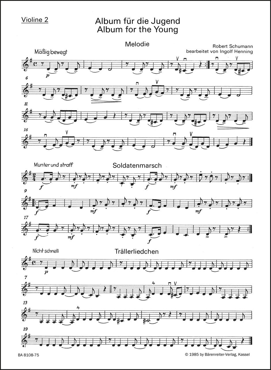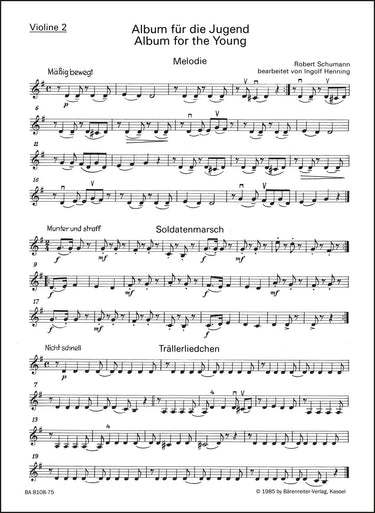 **Title**: Album für die Jugend. Auswahl für Streichtrio op. 68 | **Composer / Author**: Schumann, Robert | **Editor**: Henning, Ingolf | **Edition Type**: Part | **Instrumentation**: String trio | **Scoring/ Instrumentation**: 2. Violin | **Binding**: Stapled | **Weight**: 12.0 g | **Format**: 29,8 x 21,0 cm | **Pages**: 5 S. | **Language**: EN | Sample: https://data.baerenreiter.com/NB/BA/BA08108_75_9790006488742_nb_lrg_01.jpg
