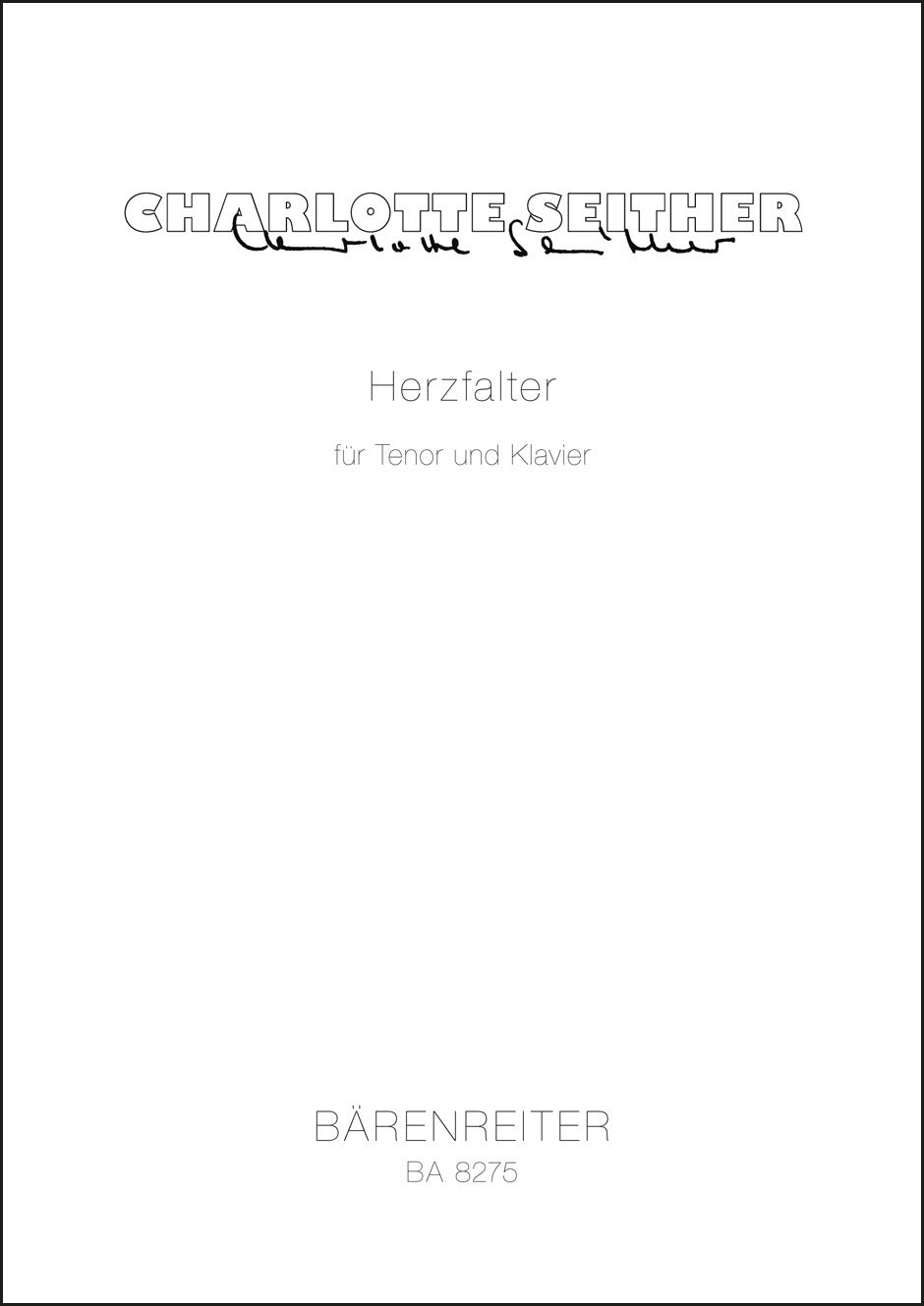 **Title**: Herzfalter für Tenor und Klavier (2000) | **Comments**: Uraufführung 19.08.2000, Hannover | **Composer / Author**: Seither, Charlotte | **Edition Type**: Singing Score | **Instrumentation**: Tenor, Piano | **Scoring/ Instrumentation**: Tenor solo, Piano | **Binding**: Ring stitching | **Duration**: 00:08:00 | **Printing**: 3. Aufl. 2023 | **Weight**: 123.0 g | **Format**: 42,0 x 30,0 cm | **Pages**: 6 S. | **Language**: EN | Sample: https://data.baerenreiter.com/NB/BA/BA08275_00_9790006525317_nb_lrg_01.jpg