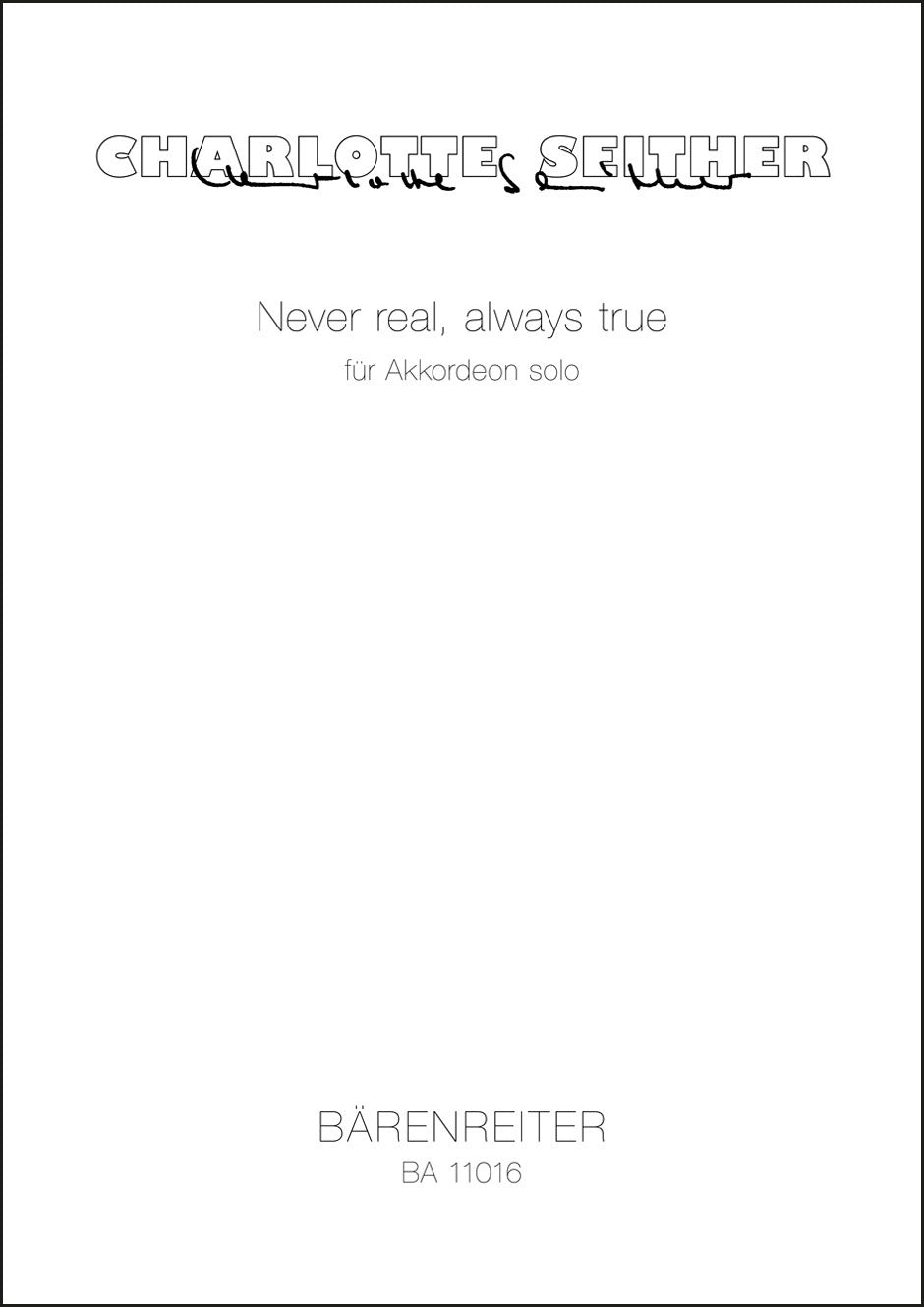 **Title**: Never real, always true for Solo Accordion (2008) | **Composer / Author**: Seither, Charlotte | **Edition Type**: Performance score | **Instrumentation**: Accordion | **Scoring/ Instrumentation**: Accordion | **Binding**: in a folder | **Printing**: 1st printing 2012 | **Weight**: 154.0 g | **Format**: 42,0 x 29,7 cm | **Pages**: 8 S. | **Language**: EN | Sample: https://data.baerenreiter.com/NB/BA/BA11016_00_9790006529414_nb_lrg_01.jpg