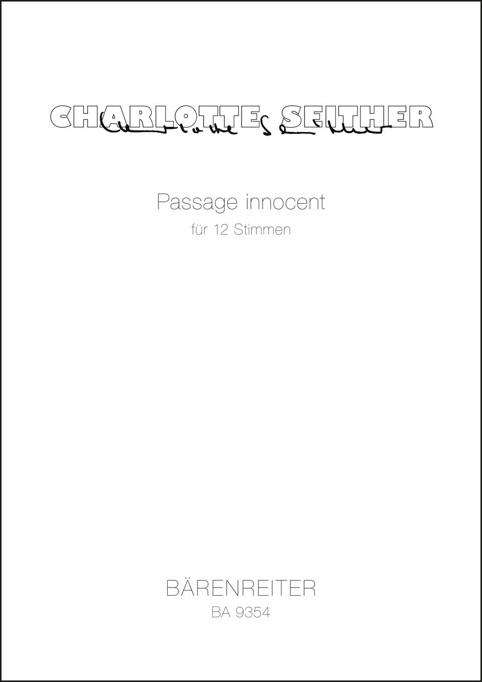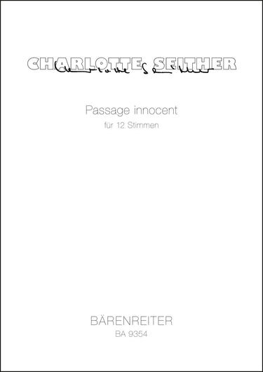 **Title**: Passage innocent for 12 voices (3S, 3A, 3T, 3B) (2006) | **Composer / Author**: Seither, Charlotte | **Edition Type**: Score | **Instrumentation**: Singing voice | **Scoring/ Instrumentation**: Vocal | **Binding**: Stapled | **Duration**: 00:07:00 | **Printing**: 1st printing 2012 | **Weight**: 206.0 g | **Format**: 39,0 x 29,7 cm | **Pages**: 29 S. | **Language**: EN | Sample: https://data.baerenreiter.com/NB/BA/BA09354_00_9790006537266_nb_lrg_01.jpg