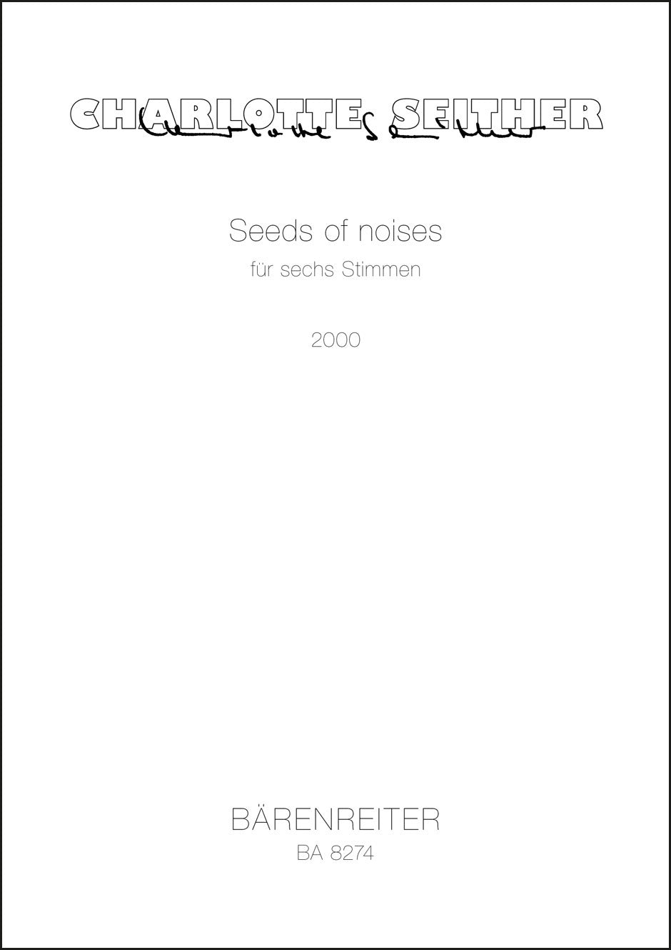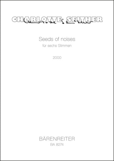 **Title**: Seeds of noises für sechs Stimmen (2000) | **Comments**: Uraufführung 09.06.2001, Hannover | **Composer / Author**: Seither, Charlotte | **Edition Type**: Singing Score | **Scoring/ Instrumentation**: Soprano solo (2), Alto solo, Tenor solo, Bass solo (2) | **Binding**: Stapled | **Printing**: 3. Aufl. 2012 | **Weight**: 145.0 g | **Format**: 42,0 x 29,5 cm | **Pages**: 13 S. | **Language**: EN | Sample: https://data.baerenreiter.com/NB/BA/BA08274_00_9790006520695_nb_lrg_01.jpg