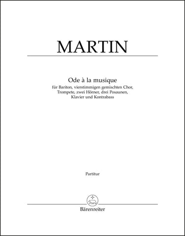 **Title**: Ode à la musique für Bariton, vierstimmigen gemischten Chor, Trompete, zwei Hörner, drei Posaunen, Klavier und Kontrabass (1961) | **Composer / Author**: Martin, Frank | **Libretto/Text by**: Machault, Guillaume de | **Edition Type**: Score | **Instrumentation**: Soloists, Choir, Orchestra | **Scoring/ Instrumentation**: Baritone solo, Mixed choir, Orchestra | **Binding**: Stapled | **Level of Difficulty**: 3.0 | **Duration**: 00:09:00 | **Printing**: 11. Aufl. 2009 | **Language of Text Part**: French, German | **Weight**: 291.0 g | **Format**: 32,8 x 25,6 cm | **Pages**: 52 S. | **Language**: EN | Sample: https://data.baerenreiter.com/NB/BA/BA06725_00_9790006482153_nb_lrg_01.jpg