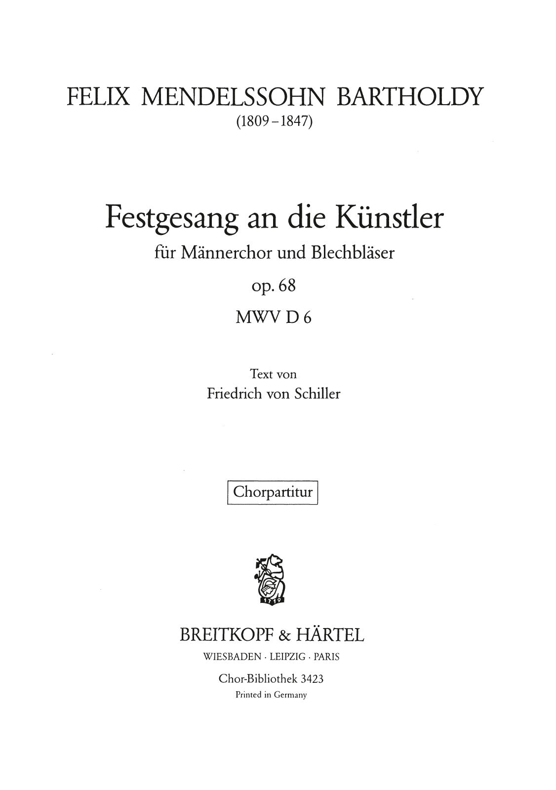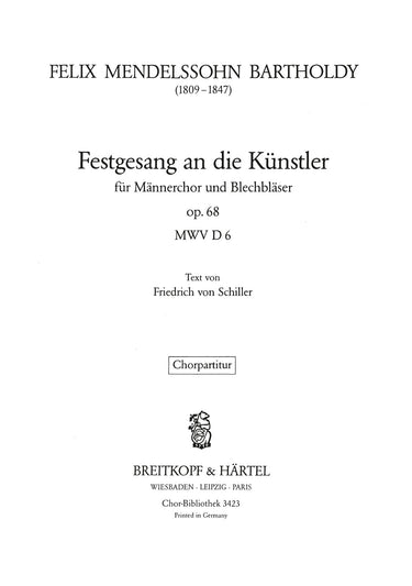 Festgesang an die Künstler Op. 68 MWV D 6 | solos,male ch,brass band | solos: TTBB – choir: TTBB – 0.0.0.0. – 4.4.4.1(oph) | Choir | Chorus | Chorus (with soloists) and orchestra | 10' | Romantic | Sheet Music | choral score | | | 16 | stapled | 19 x 27 cm