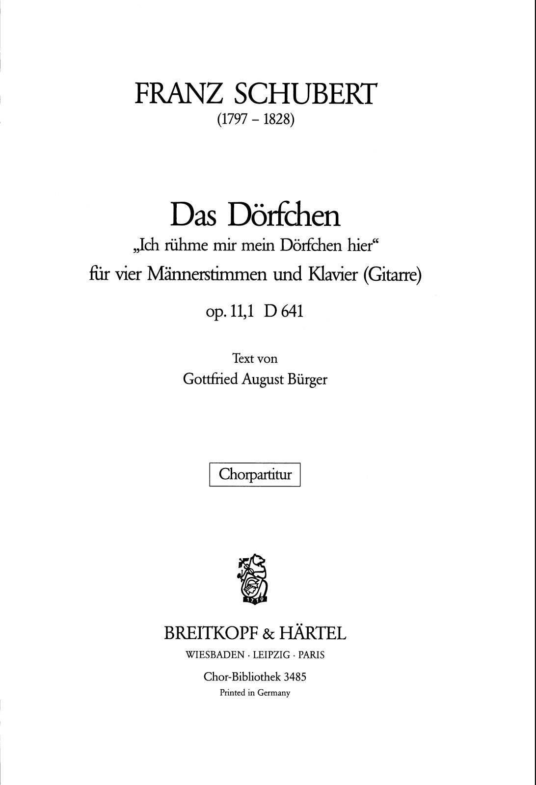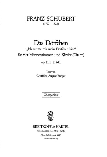 Das Doerfchen D 641 [Op. 11/1] | “Ich rühme mir” | male ch,pno(guit) | Choir | Chorus | Chorus and piano | Romantic | Song | Sheet Music | choral score | | | 8 | stapled | 19 x 27 cm