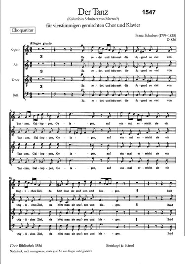Der Tanz D 826 | “Es redet und träumet die Jugend so viel” | mix ch,pno | Choir | Chorus | Chorus (with soloists) and piano | Romantic | Song | Dances/marches | Sheet Music | choral score | | | 2 | 19 x 27 cm