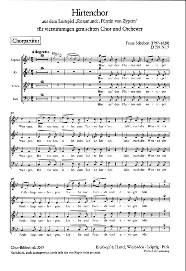 Rosamunde, Princess of Cyprus D 797 [Op. 26] | No. 7 Shepherd's Chorus | mix ch,orch | choir: SATB – 2.2.2.2 – 2.0.0.0 – str | Choir | Chorus | Chorus (with soloists) and orchestra | 4' | Romantic | Song | Sheet Music | choral score | | | 8 | stapled | 16,5 x 24,5 cm