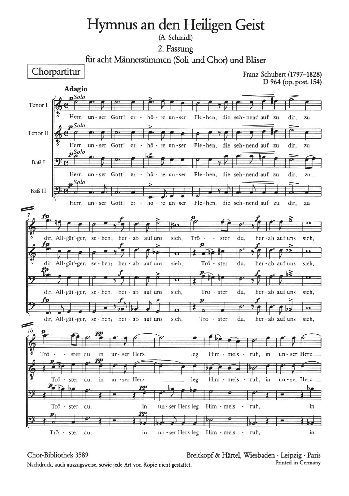 Hymnus an den heiligen Geist D 964 [Op. 154] | solos,male ch,wind insts | solos: TTBB - choir: TTBB - 0.2.2.2 - 2.2.3.0