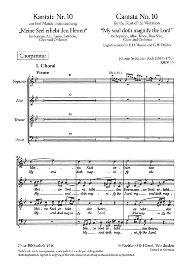 Cantata BWV 10 “My soul doth magnify the Lord” | Visitation of the Blessed Virgin Mary [6th Sunday after Trinity] | solos,mix ch,orch | solos: SATB – choir: SATB – 0.2.0.0. – 0.1.0.0. – str – bc | 22' | Baroque | Cantata | Sheet Music | choral score | | | 12 | German / English | stapled | 19 x 27 cm