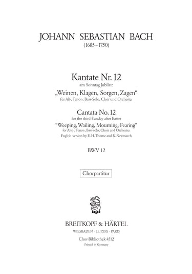 Cantata BWV 12 “Weeping, wailing, mourning, fearing” | Jubilate [3rd Sunday after Easter] | solos,mix ch,orch | solos: ATB – choir: SATB – 0.1.0.1 – 0.1.0.0 – str(va divided) – bc | 25' | Baroque | Cantata | Sheet Music | choral score | | | 12 | German / English | stapled | 19 x 27 cm