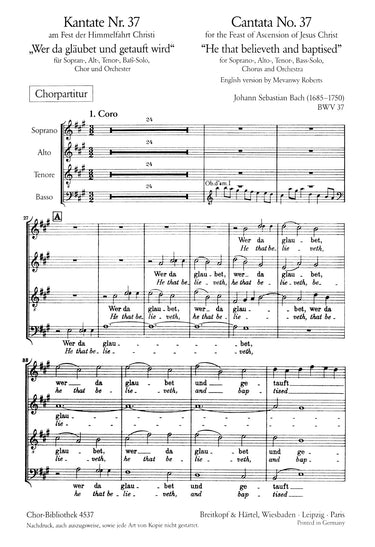 Cantata BWV 37 “He that believeth and baptized is” | Ascension Day | solos,mix ch,orch | solos: SATB – choir: SATB – 0.0.2ob d’am.0.0 – 0.0.0.0 – str – bc | Choir | Chorus | Chorus a cappella | 20' | Baroque | Cantata | Sheet Music | choral score | | | 12 | German / English | stapled | 19 x 27 cm