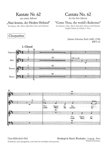 Cantata BWV 62 “Come Thou, the world's Redeemer” | 1st Sunday in Advent | solos,mix ch,orch | solos: SATB – choir: SATB – 0.2.0.0 – 1.0.0.0 – str – bc | Choir | Chorus | Chorus (with soloists) and orchestra | 17' | Baroque | Cantata | Sheet Music | choral score | | | 8 | ger-engl | stapled | 19 x 27 cm