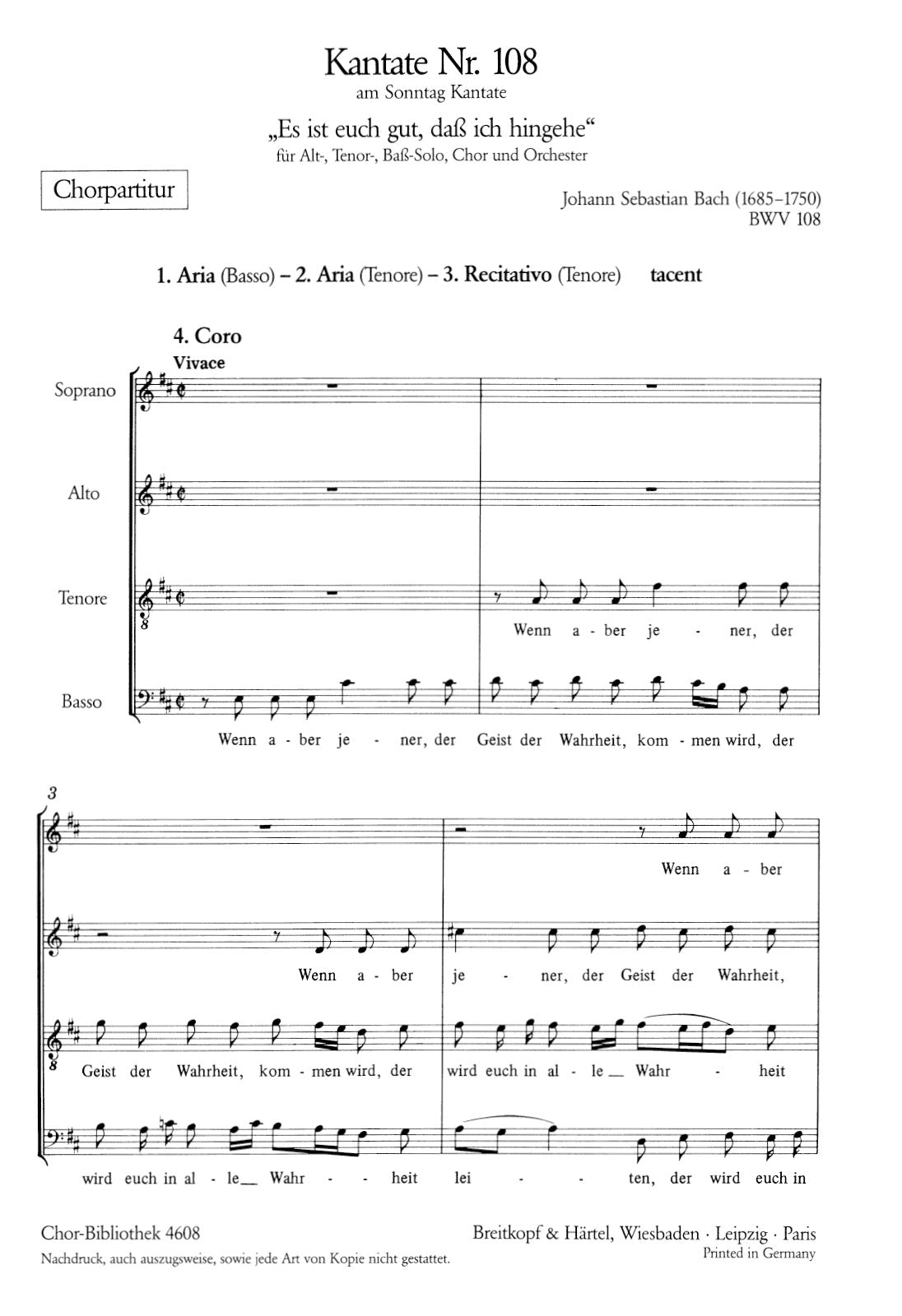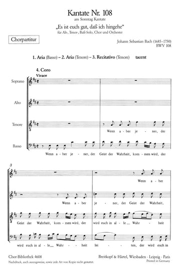 Cantata BWV 108 “Es ist euch gut, dass ich hingehe” | Cantate [4th Sunday after Easter] | solos,mix ch,orch | solos: ATB – choir: SATB – 0.0.2ob d’am.0.0 – 0.0.0.0 – str – bc | Choir | Chorus | Chorus (with soloists) and orchestra | 18' | Baroque | Cantata | Sheet Music | choral score | | | 12 | stapled | 19 x 27 cm