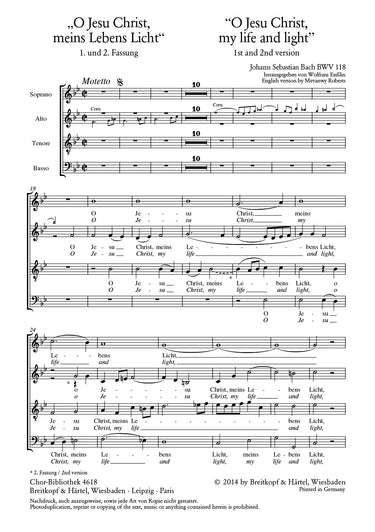 “O Jesu Christ, my Life and Light” BWV 118 | 1st and 2nd Version – Urtext | mix ch,orch | 1. version: 0.0.0.0. – 2litui.0.corn.3.0 – db / 2. version: 0.2(ad lib.).ob.da cac(cor ang.)0.1 – 2litui. 0.0.0 – str – db | Choir | Chorus | Chorus (with soloists) and orchestra | 8´ | Baroque | Motet | Sheet Music | choral score | Enßlin, Wolfram | | 4 | German / English | stapled | 19 x 27 cm