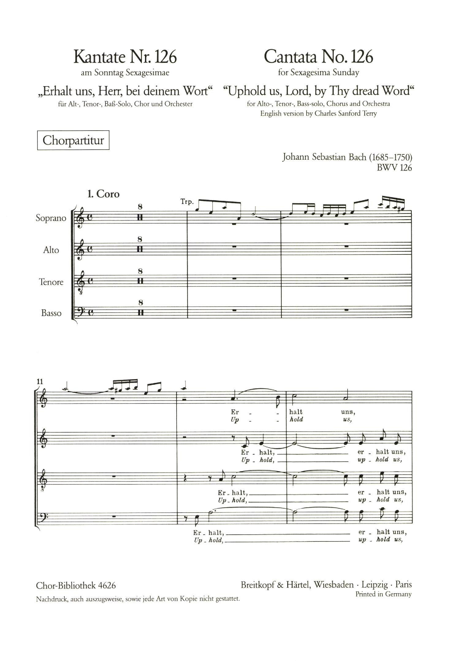 Cantata BWV 126 “Uphold us, Lord, by Thy dread Word” | Sexagesimae Sunday – Urtext | solos,mix ch,orch | solos: ATB – choir: SATB – 0.2.0.0 – 0.1.0.0 – str – bc | 20' | Baroque | Cantata | Sheet Music | choral score | | | 8 | stapled | 19 x 27 cm