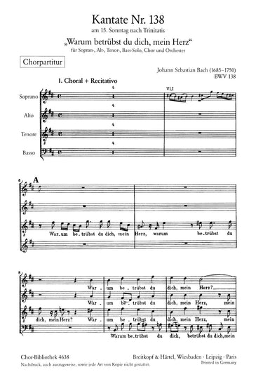 Cantata BWV 138 “Warum betruebst du dich, mein Herz” | 15th Sunday after Trinity | solos,mix ch,orch | solos: SATB – choir: SATB – 0.0.2ob d'am.0.0 – 0.0.0.0 – str – bc | Choir | Chorus | Chorus a cappella | 20' | Baroque | Cantata | Sheet Music | choral score | | | 12 | stapled | 19 x 27 cm