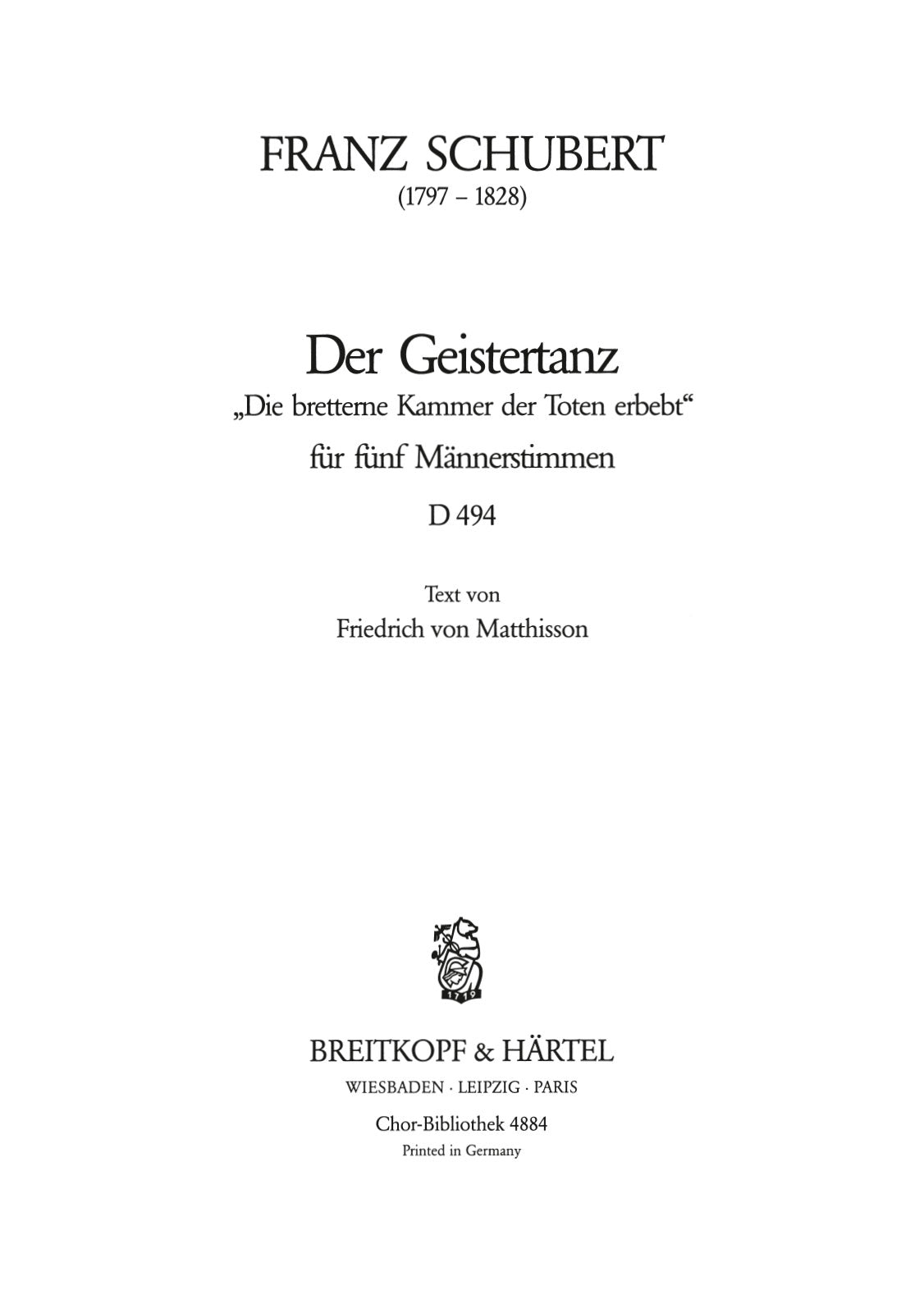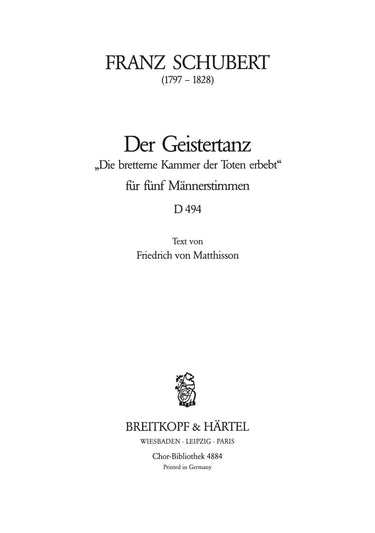 Der Geistertanz D 494 | “Die bretterne Kammer der Toten erbebt” | male ch | Choir | Chorus | Chorus a cappella | Romantic | Song | Sheet Music | choral score | | | 4 | German | stapled | 19 x 27 cm