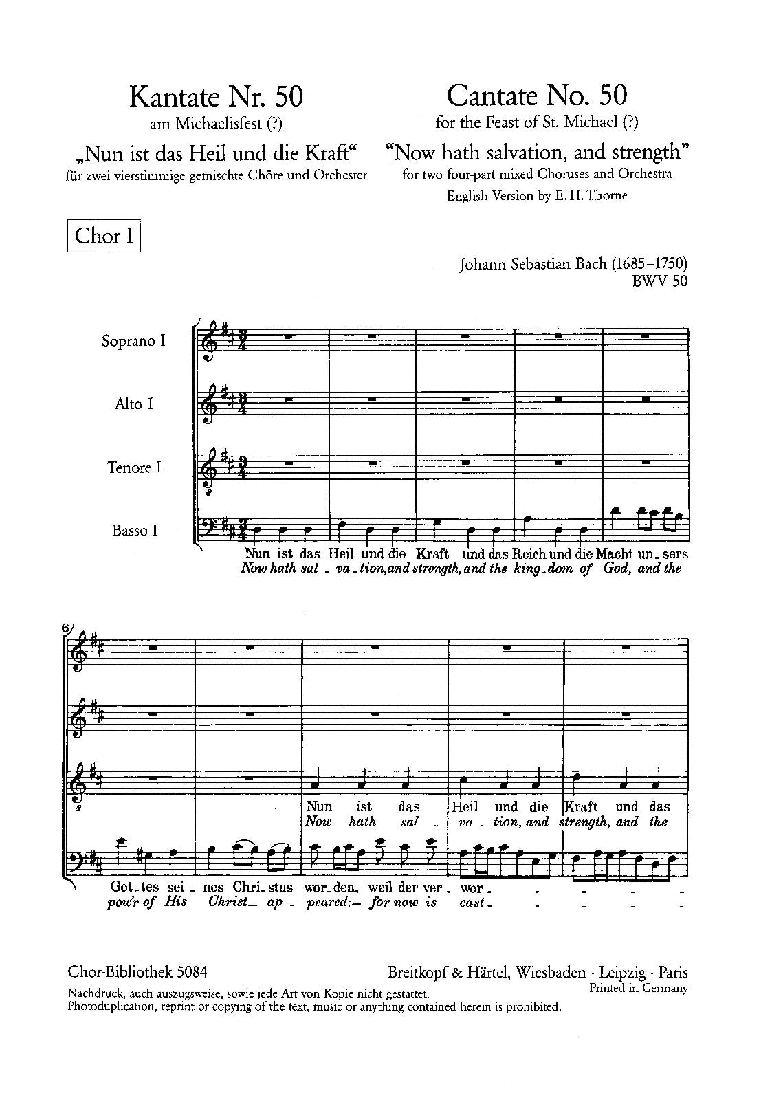 Cantata BWV 50 “Now hath Salvation, and Strength” | At St Michael and All Angels (?) - single cantata movement | dble mix ch,orch | choir: SATB/SATB – 0.2.cor ang.0.0 – 0.3.0.0 – timp – str – bc | Choir | Chorus | Chorus (with soloists) and orchestra | 5' | Baroque | Cantata | Sheet Music | choral score | | | 12 | ger-engl | stapled | 19 x 27 cm