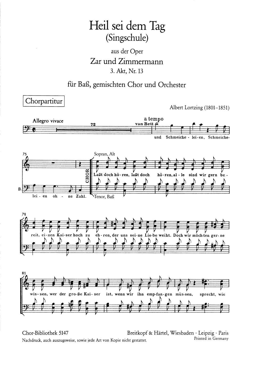 Tsar and Carpenter - Heil sei dem Tag | Singschule ('Den hohen Herrscher wuerdig zu empfangen') | B,mix ch,orch | solos: B – choir: SATB – 2.2.2.2 – 4.3.2.0 – timp – str | Choir | Chorus | Chorus (with soloists) and orchestra | Romantic | Song | Sheet Music | choral score | | | 8 | stapled | 19 x 27 cm