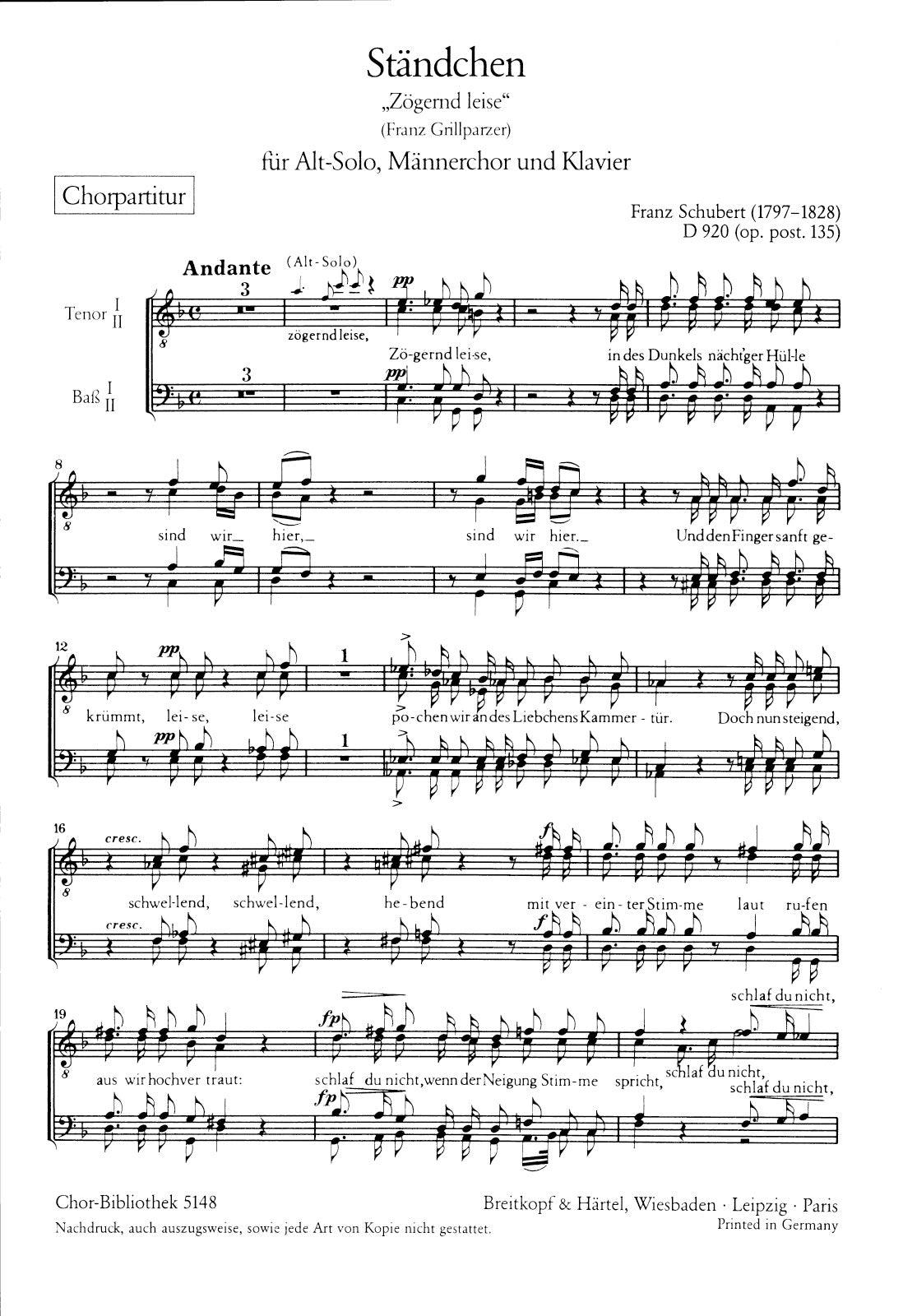 Serenade D 920 [Op. posth. 135] | “Zögernd leise” (Version No. 1) | A,male ch,pno | solo: A – choir: TTBB – pno | 50' | Romantic | Song | Sheet Music | choral score | | | 4 | German | stapled | 19 x 27 cm