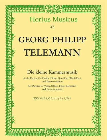 **Title**: Little Chamber Music | **Subtitle**: Six Partitas for violin (flute, oboe, recorder) and bc | **Composer / Author**: Telemann, Georg Philipp | **Editor**: Ruf, Hugo | **Preface**: Ruf, Hugo | **Edition Type**: Performance score, Set of parts, Anthology | **Scoring/ Instrumentation**: Violin, Recorder, Flute, Oboe, Basso continuo | **Binding**: Stapled | **Level of Difficulty**: 3.0 | **Grade (UK)**: 5 | **Printing**: 27th printing 2021 | **Weight**: 341.0 g | **Format**: 30,0 x 23,0 cm | **Pages**: 48/20/20 S. | **Language**: EN | Sample: https://data.baerenreiter.com/NB/HM/HM00047_00_9790006000777_nb_lrg_01.jpg