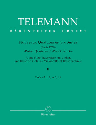 **Title**: Nouveaux Quatuors en Six Suites II for Flute, Violin, Viola da gamba or Violoncello and Basso continuo "Paris Quartets" | **Misc Information**: Paris 1738 | **Comments on Version**: The set of parts include a part for figured bass | **Composer / Author**: Telemann, Georg Philipp | **Editor**: Bergmann, Walter | **Preface**: Poetzsch, Ute | **Edition Type**: Score, Set of parts, Urtext edition, Anthology | **Instrumentation**: Flute, String instruments, Basso continuo | **Scoring/ Instrumentation**: Flute, Violin, Viola da gamba, Violoncello, Basso continuo | **Binding**: in a folder | **Printing**: 3rd printing 2019 | **Weight**: 901.0 g | **Format**: 31,0 x 24,5 cm | **Pages**: IX, 74/22/22/20/20/19/28 S. | **Language**: EN | Sample: https://data.baerenreiter.com/NB/BA/BA05882_00_9790006520060_nb_lrg_01.jpg