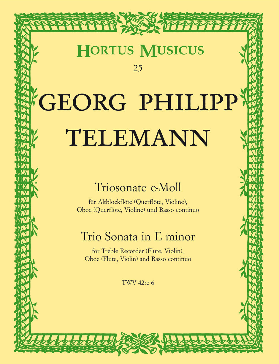 **Title**: Triosonate für Altblockflöte (Querflöte, Violine), Oboe (Querflöte, Violine) und Basso continuo e-Moll TWV 42:e6 | **Composer / Author**: Telemann, Georg Philipp | **Editor**: Ruëtz, Manfred | **Edition Type**: Performance score, Set of parts | **Scoring/ Instrumentation**: Treble recorder (Flute, Violin), Oboe (Flute, Violin), Basso continuo (Violoncello, Bassoon) | **Binding**: Stapled | **Level of Difficulty**: 3.0 | **Printing**: 14. Aufl. 2024 | **Weight**: 121.0 g | **Format**: 30,0 x 23,0 cm | **Pages**: 16/5/5/4 S. | **Language**: EN | Sample: https://data.baerenreiter.com/NB/HM/HM00025_00_9790006000418_nb_lrg_01.jpg