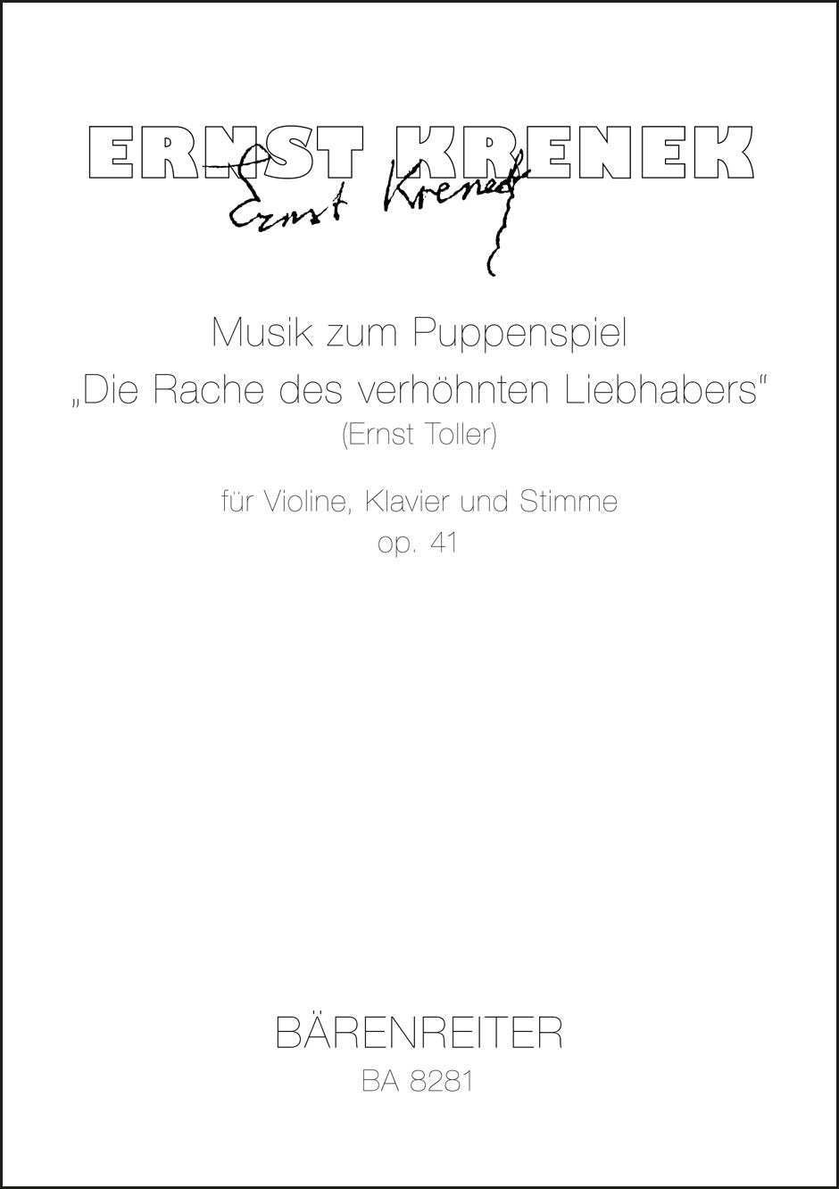 **Title**: Musik zum Puppenspiel "Die Rache des verhöhnten Liebhabers" (Ernst Toller) for violin, piano and voice op. 41 (1925) | **Composer / Author**: Krenek, Ernst | **Edition Type**: Performance score, Singing Score, Part | **Instrumentation**: Violin, Piano, Vocal | **Scoring/ Instrumentation**: Violin, Piano, Vocal | **Binding**: Stapled | **Duration**: 00:12:00 | **Printing**: 3rd printing 2013 | **Weight**: 152.0 g | **Format**: 36,4 x 25,8 cm | **Pages**: 15/5 S. | **Language**: EN | Sample: https://data.baerenreiter.com/NB/BA/BA08281_00_9790006531103_nb_lrg_01.jpg