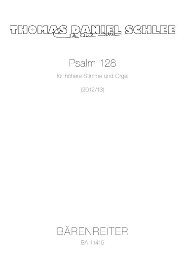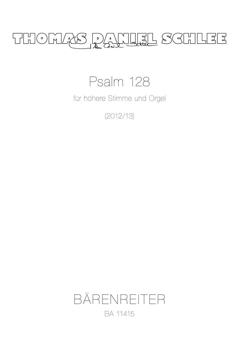 **Title**: Psalm 128 for higher voice and organ (2012/2013) | **Comments**: World Premiere 01/06/2017, Vienna | **Composer / Author**: Schlee, Thomas Daniel | **Edition Type**: Singing Score | **Scoring/ Instrumentation**: High voice, Organ | **Binding**: Stapled | **Level of Difficulty**: 4.0 | **Duration**: 00:07:00 | **Printing**: 1st printing 2020 | **Language of Text Part**: Latin | **Weight**: 67.0 g | **Format**: 30,0 x 21,0 cm | **Pages**: 7 S. | **Language**: EN | Sample: https://data.baerenreiter.com/NB/BA/BA11415_00_9790006569601_nb_lrg_01.jpg