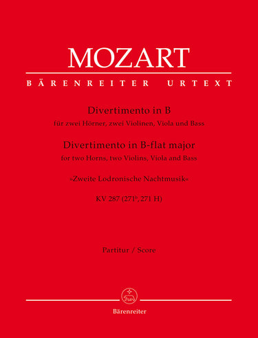**Title**: Divertimento for two Horns, two Violins, Viola and Bass in B-flat major K. 287 (271b, 271 H) "Zweite Lodronische Nachtmusik" | **Composer / Author**: Mozart, Wolfgang Amadeus | **Editor**: Dunning, Albert | **Edition Type**: Score, Urtext edition | **Instrumentation**: Orchestra | **Scoring/ Instrumentation**: Horns (2), Violins (2), Viola, Basso | **Binding**: Stapled | **Printing**: 1st printing 2021 | **Weight**: 271.0 g | **Format**: 31,0 x 24,3 cm | **Pages**: VII, 52 S. | **Language**: EN | Sample: https://data.baerenreiter.com/NB/BA/BA08809_00_9790006568970_nb_lrg_01.jpg