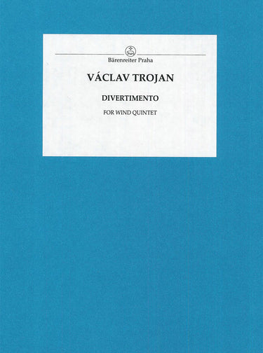 **Title**: Divertimento per quintetto a fiato | **Composer / Author**: Trojan, Václav | **Edition Type**: Performance score, Set of parts | **Scoring/ Instrumentation**: Flute, Oboe, Clarinet, Bassoon, Horn | **Binding**: Stapled | **Duration**: 00:12:00 | **Weight**: 361.0 g | **Format**: 31,0 x 23,5 cm | **Pages**: 36/8/7/9/9/9 S. | **Language**: EN | Sample: https://data.baerenreiter.com/NB/H/H06250_00__nb_lrg_01.jpg