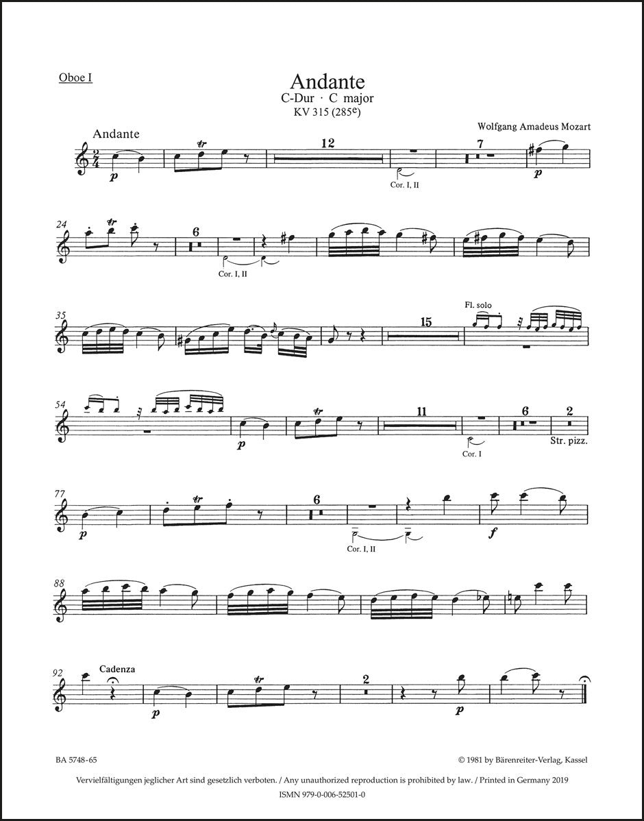 **Title**: Andante for Flute and Orchestra in C major K. 315 (285e) | **Composer / Author**: Mozart, Wolfgang Amadeus | **Editor**: Giegling, Franz | **Edition Type**: Wind set, Urtext edition | **Scoring/ Instrumentation**: 1. Oboe, 2. Oboe, 1. Horn, 2. Horn | **Binding**: Single sheet | **Duration**: 00:06:00 | **Weight**: 38.0 g | **Format**: 32,5 x 25,5 cm | **Pages**: 1/1/1/1 S. | **Language**: EN | Sample: https://data.baerenreiter.com/NB/BA/BA05748_65_9790006525010_nb_lrg_01.jpg